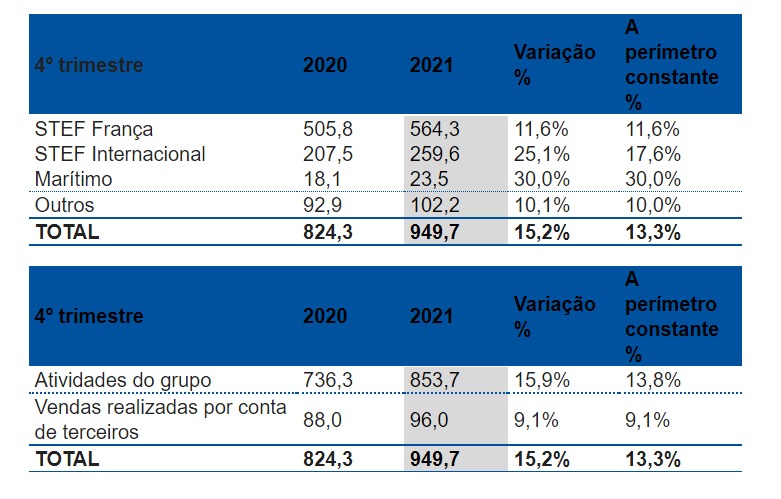O Grupo STEF, especialista no transporte e logística sob temperatura controlada para produtos alimentares, anuncia um volume de negócios de 3,5 mil milhões de euros no ano 2021, um crescimento de 11,5% (+9,4% a perímetro constante), dos quais 950 M€ no 4º trimestre que regista um crescimento de 15,2% (13,3% a perímetro constante).