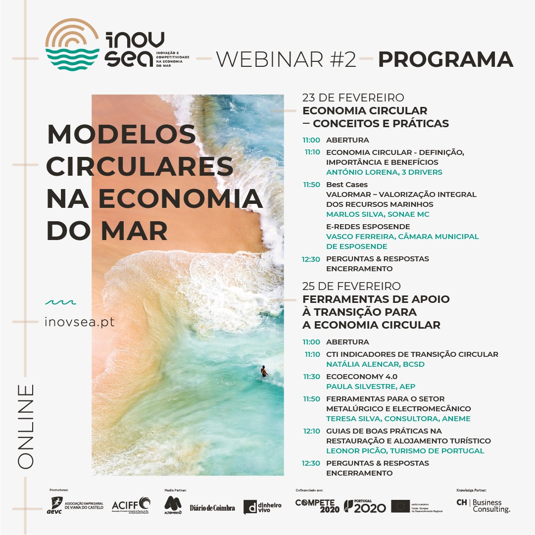 Nos próximos dias 23 e 25 de fevereiro terá lugar o segundo webinar do projeto INOVSEA, que será transmitido online. Este webinar tem como temática “Modelos Circulares na Economia do Mar” e irá desdobrar-se em dois subtópicos: “Economia Circular - Conceitos e Práticas” e “Ferramentas de Apoio à Transição para a Economia Circular”.